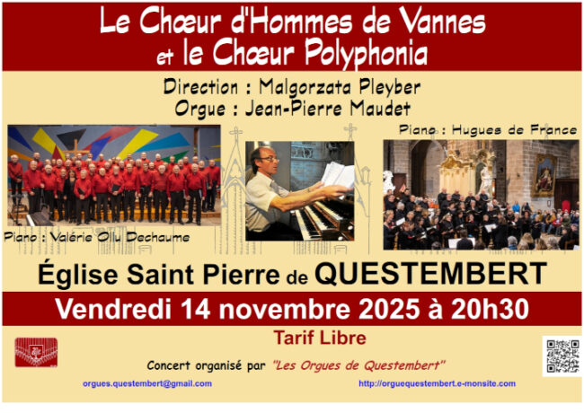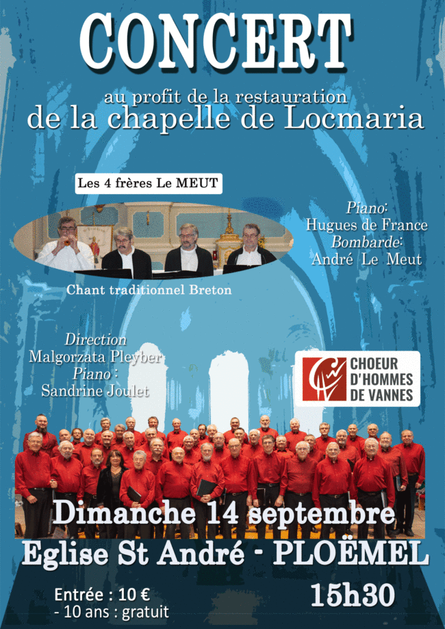 Concert caritatif pour la restauration de la chapelle Locmaria de Ploëmel 1ere partie le chœur des 4 frères Le MEUT Chants traditionnels Breton et piano et bombarde 2eme partie Chœur d’Hommes de Vannes Musique classique contemporaine éclectique 14 sept 2025 à 15h30
