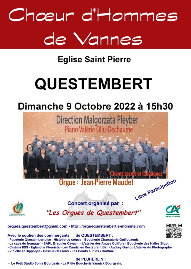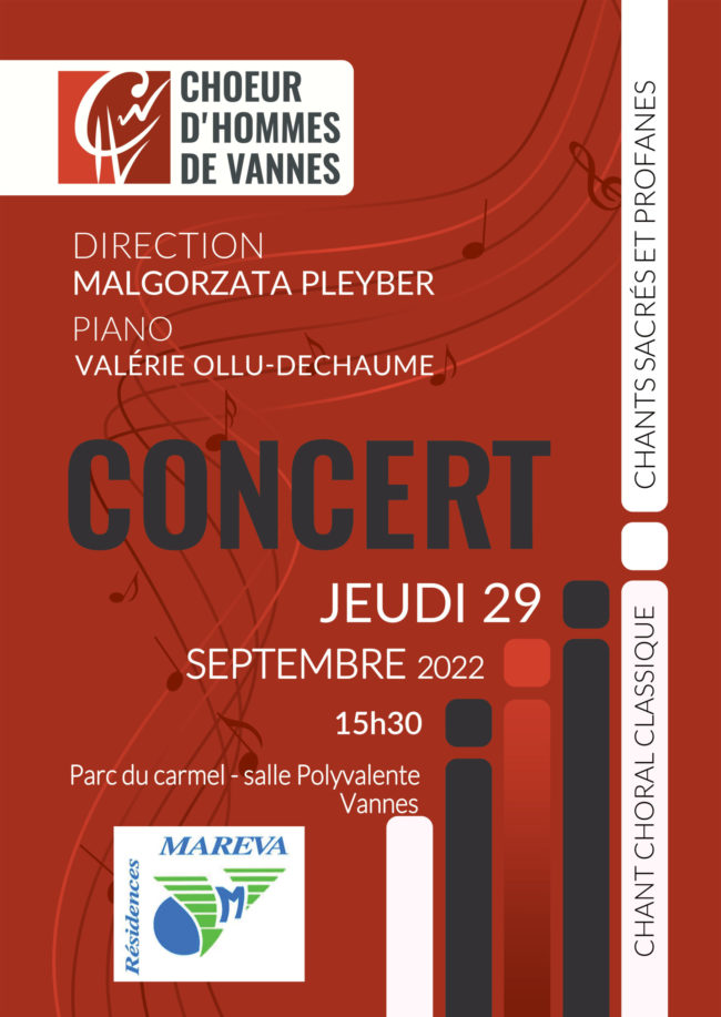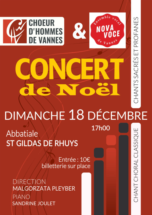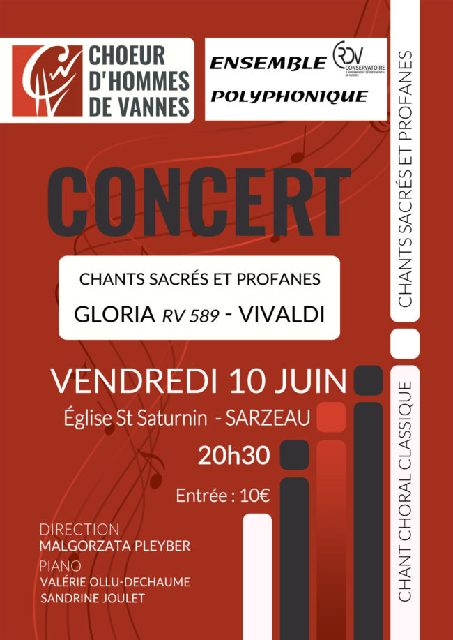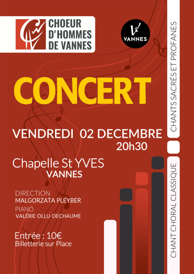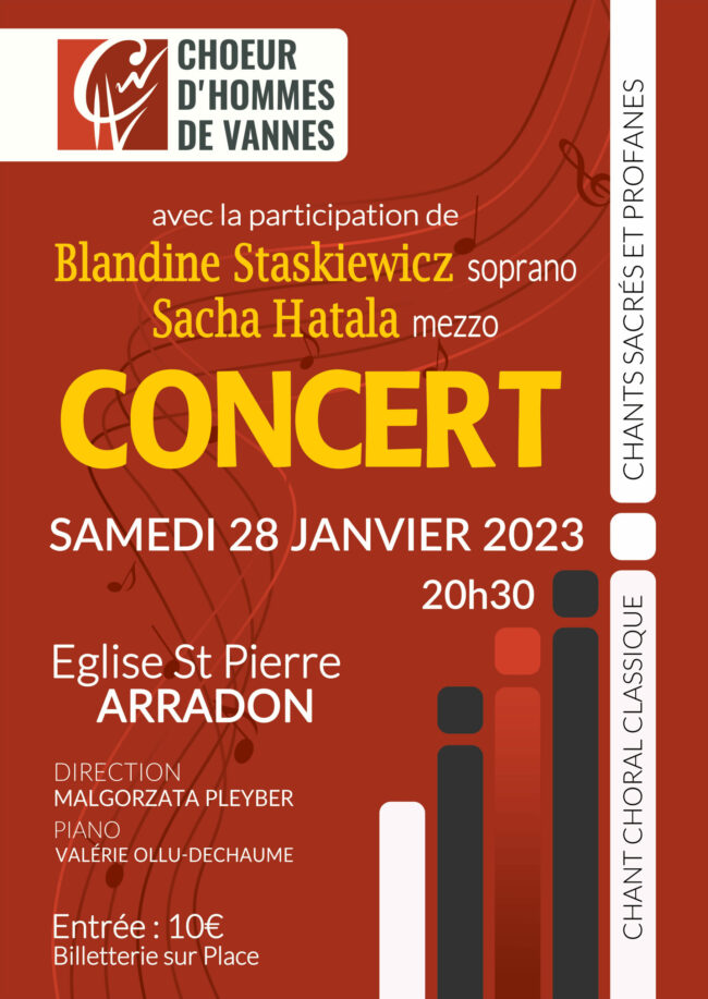 INFOLOCALE Sous la direction de Malgorzata Pleyber, le Chœur d’hommes de Vannes, avec la participation de Blandine Staskiewicz Mezzo Soprano, et de Sacha Hatala Soprano, aura la joie de vous accueillir lors d’un concert en l’église Saint-Pierre d’Arradon, le samedi 28 janvier à 20h30. Le Chœur D’hommes De Vannes, ensemble de 50 choristes, unique en son…